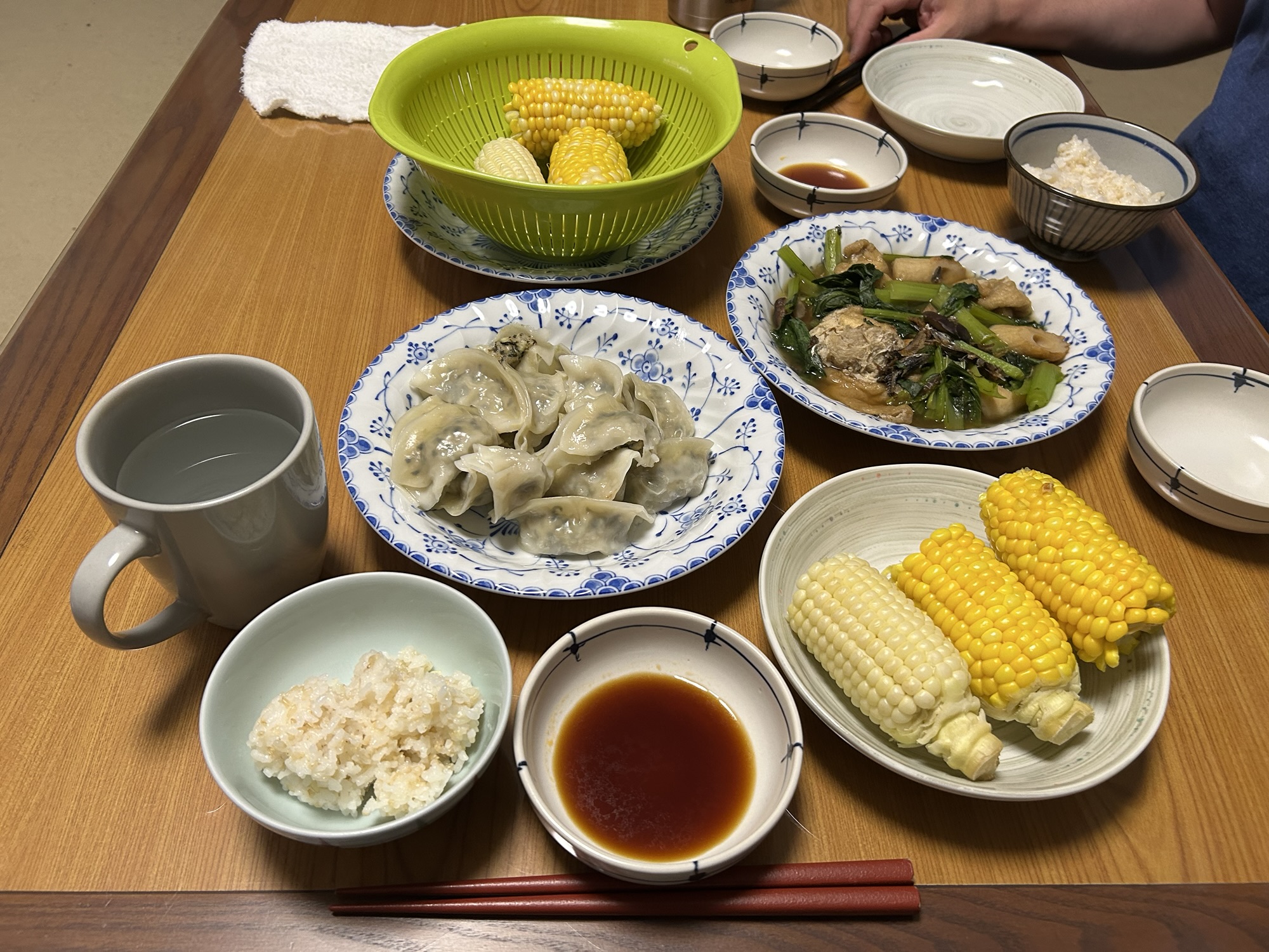 夜はいただきもののエゴマ餃子。香りと風味が最高😆💕それと、初物のとうもろこし。3種の食べ比べ。どれも美味し〜い😋