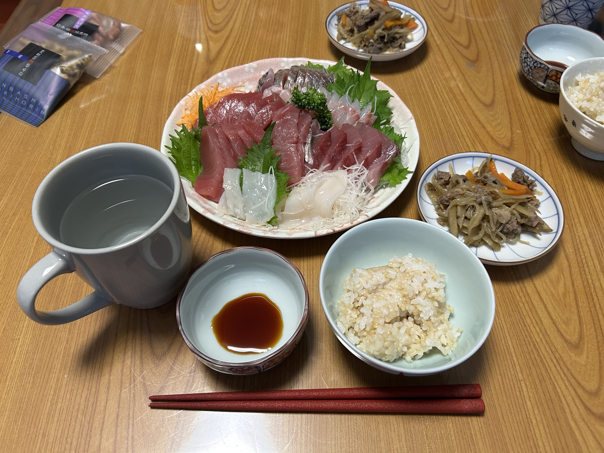 夜はスーパーのお刺身ですが!この豪華さ✨妹が整えてくれました。素晴らしい。尊敬です🥹