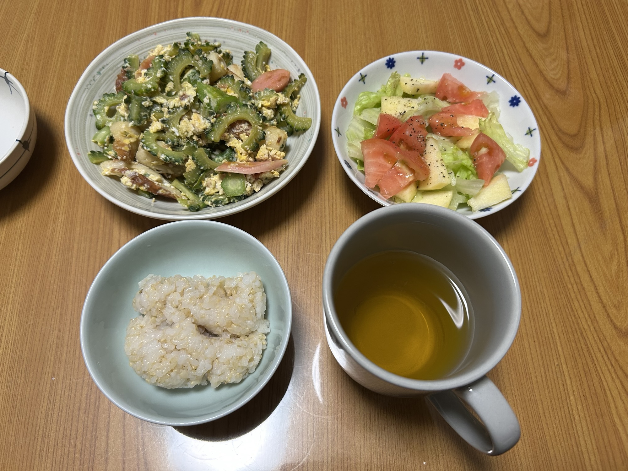 夜はゴーヤチャンプルー💕魚肉ソーセージとちくわを入れて。さらにオクラも入れてみました。まさに夏☀️なチャンプルーです。おいし😋♪