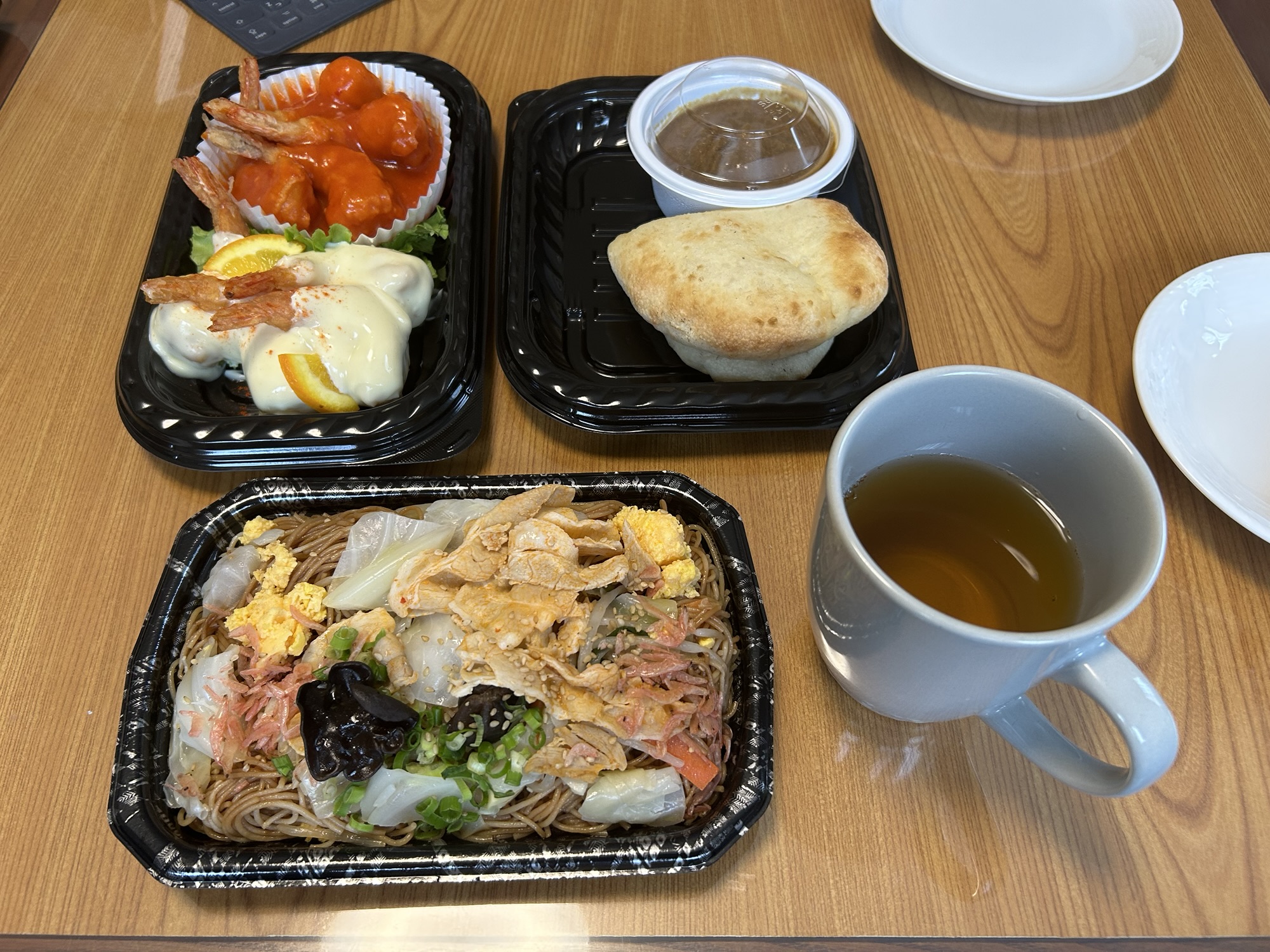 ブランチは、だんなさんが買ってきてくれました。焼きそばではなく焼きビーフンを買ってくるあたり、かなり胃袋つかまれてます!!!