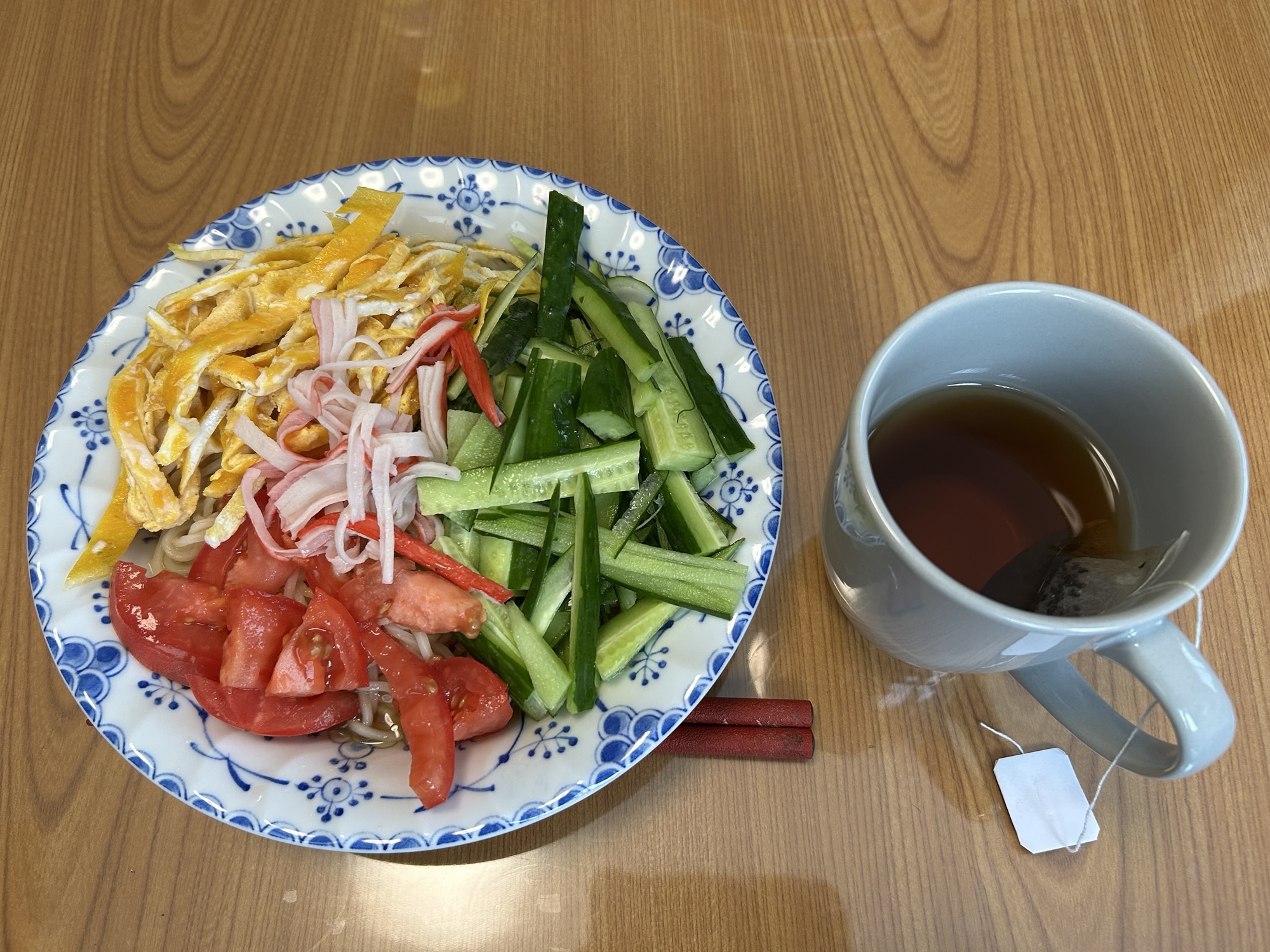 お昼は、だんなさんが作ってくれた豪快な冷やし中華!ちゃんと甘い卵焼きを作ってくれて、きゅうりもみずみずしくて、サイコー!