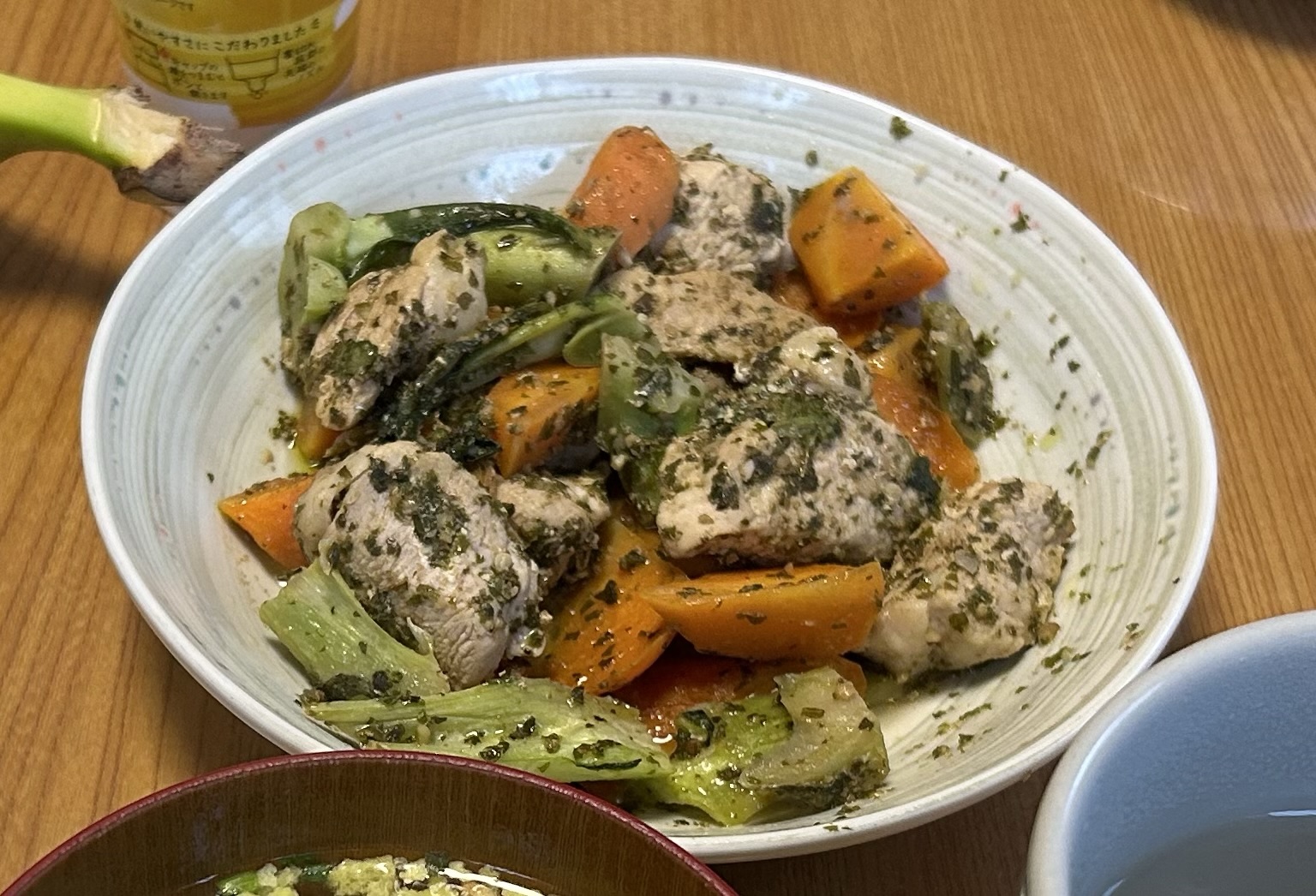 いただきものの大葉のジェノベーゼ風、大葉の香りが豊かで、鶏肉とお野菜が高級な一品に。美味しくいただきました😋💕
